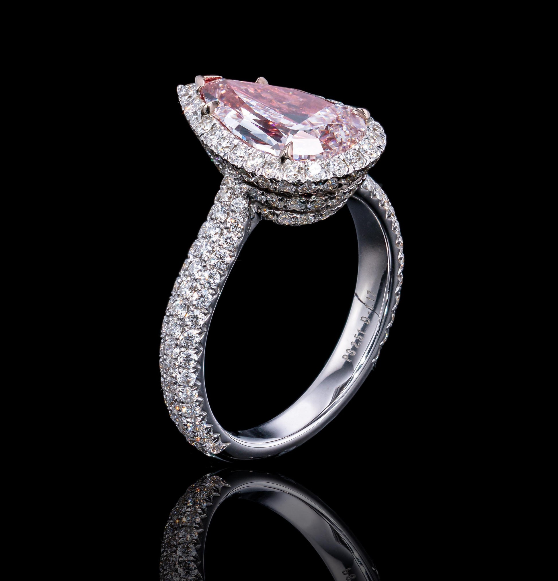Showcasing a very special and rare Gia certified natural pear shape faint pink diamond weighing over 2.50 carats. We specialize in creating special mountings for pink diamonds that will increase the color and bring it out the maximum potential of the center. Total weight shown in title.