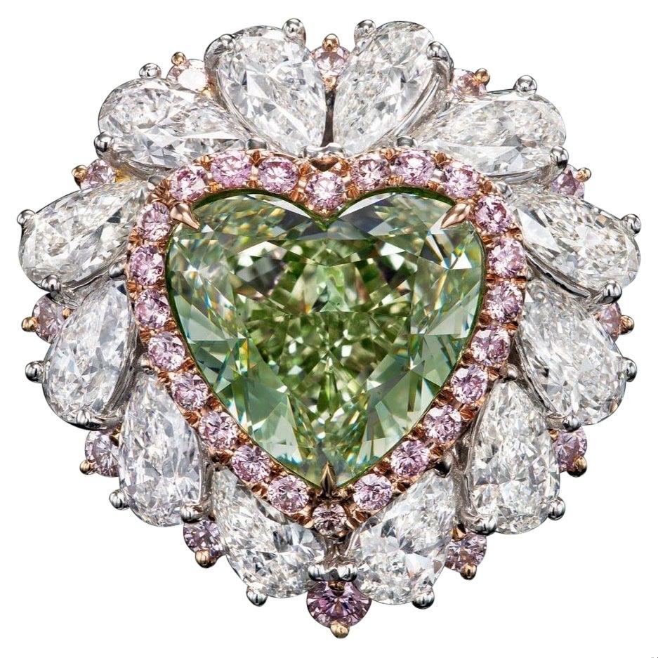 Showcasing a very special and rare Gia certified natural fancy intense Green heart shape over 6.00 astonishing carats set in the center.