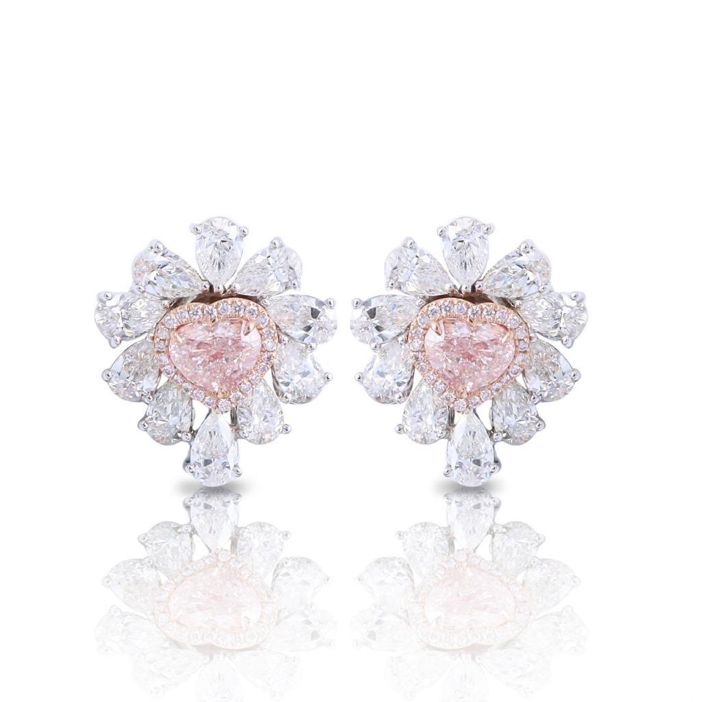The focal point of these magnificent earrings feature 2 heart shape natural Fancy light Pink diamonds totaling 3.00 carats. Please inquire for details. An additional 7.27 carats of colorless diamonds creating this striking earrings into an